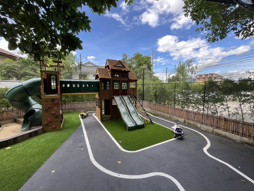 Family-friendly restaurant with indoor and outdoor play areas for kids